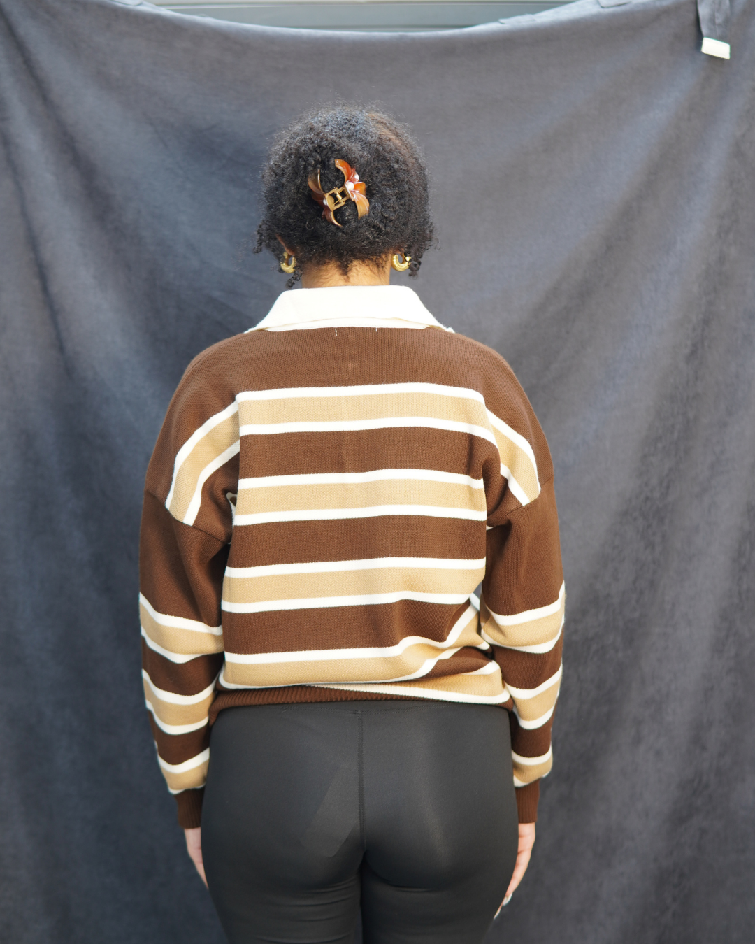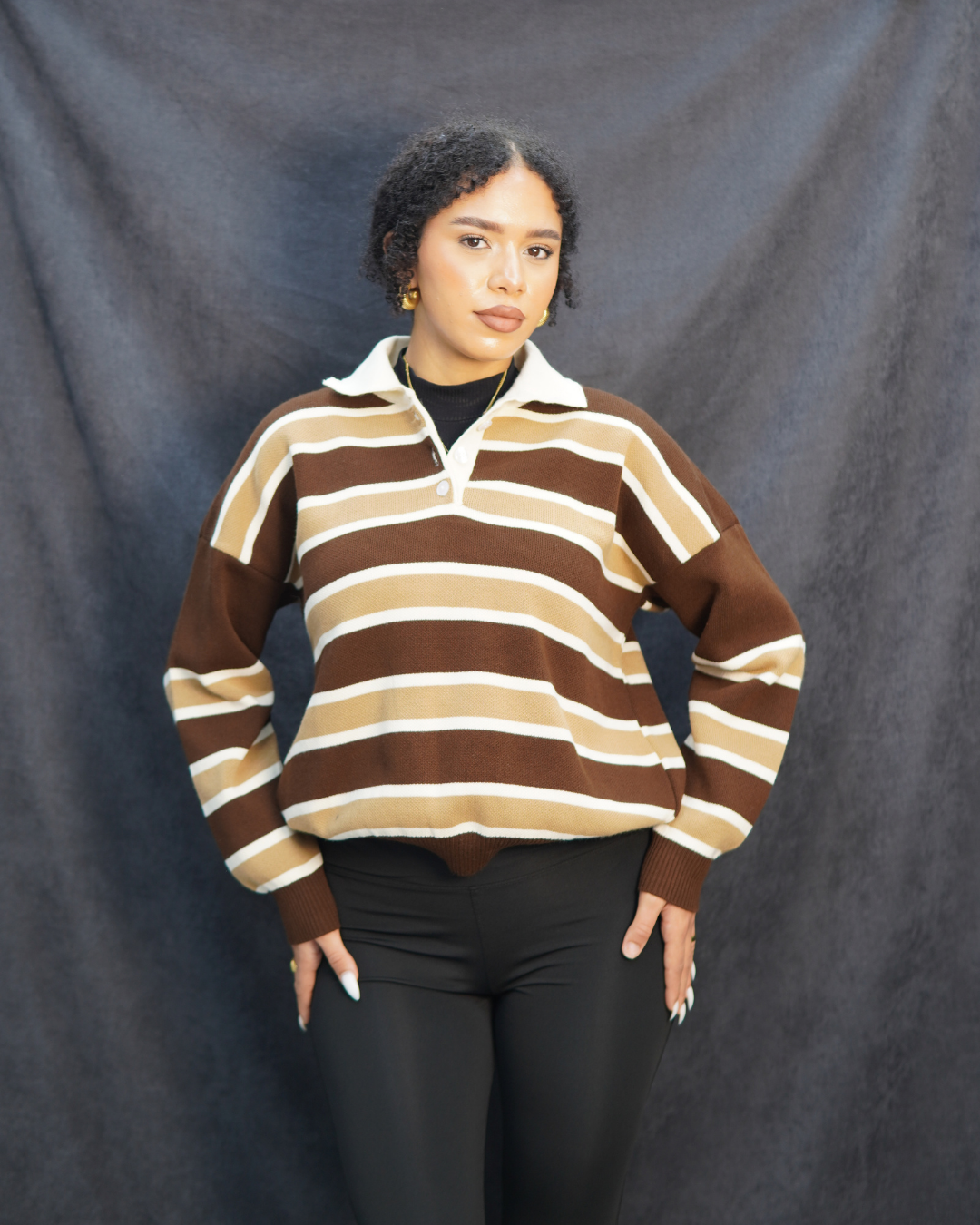 Kahverengi çizgili triko kazak