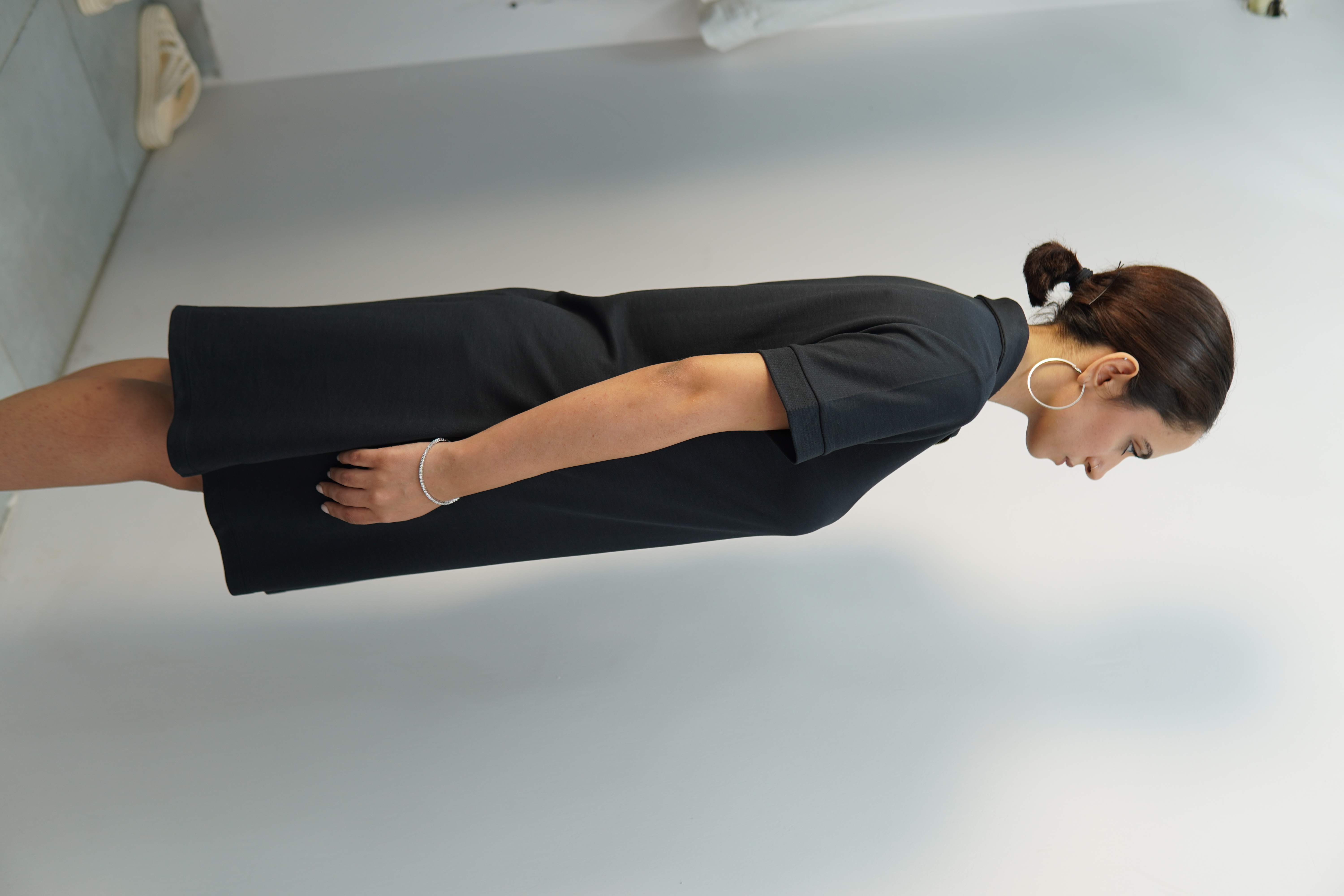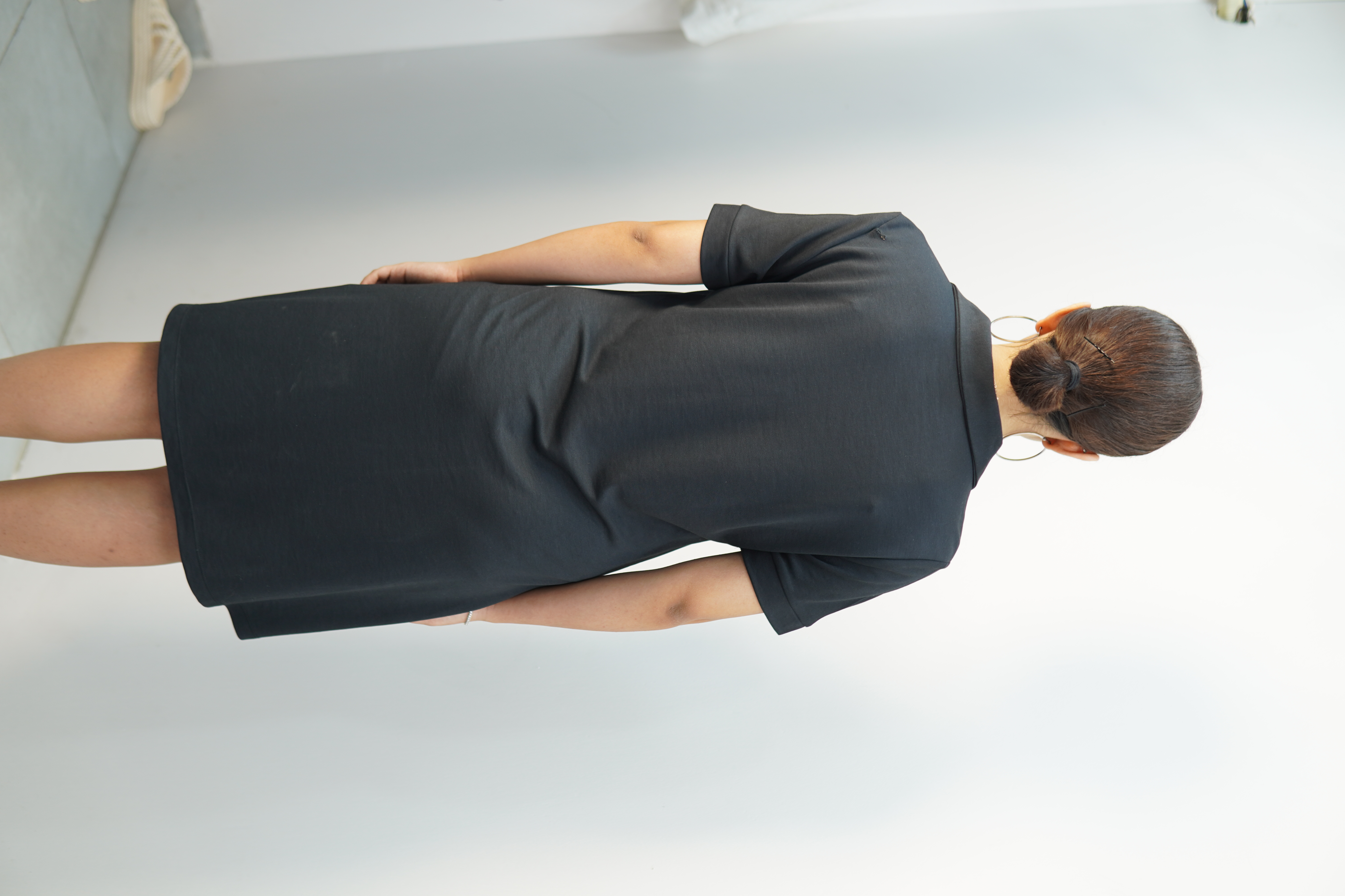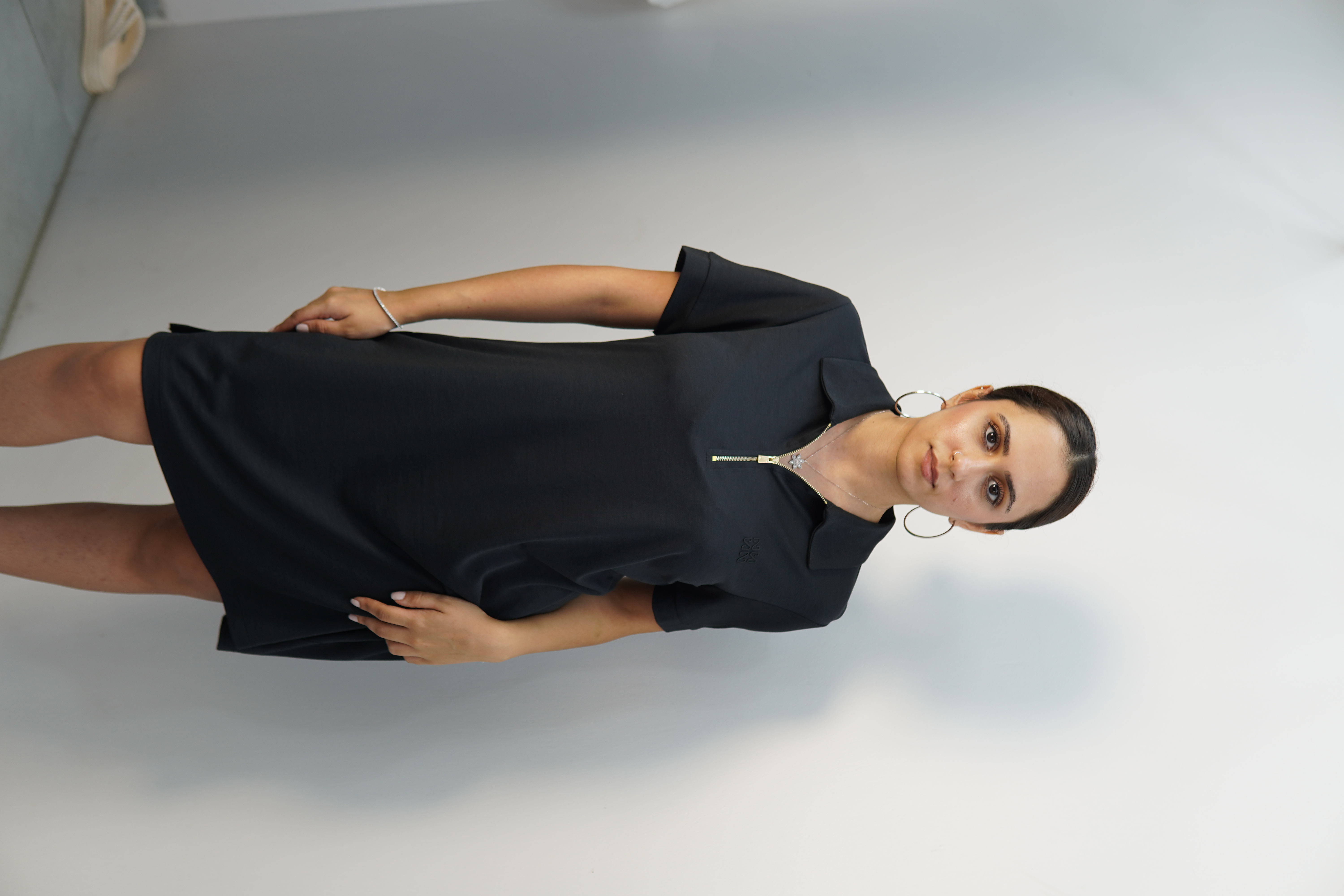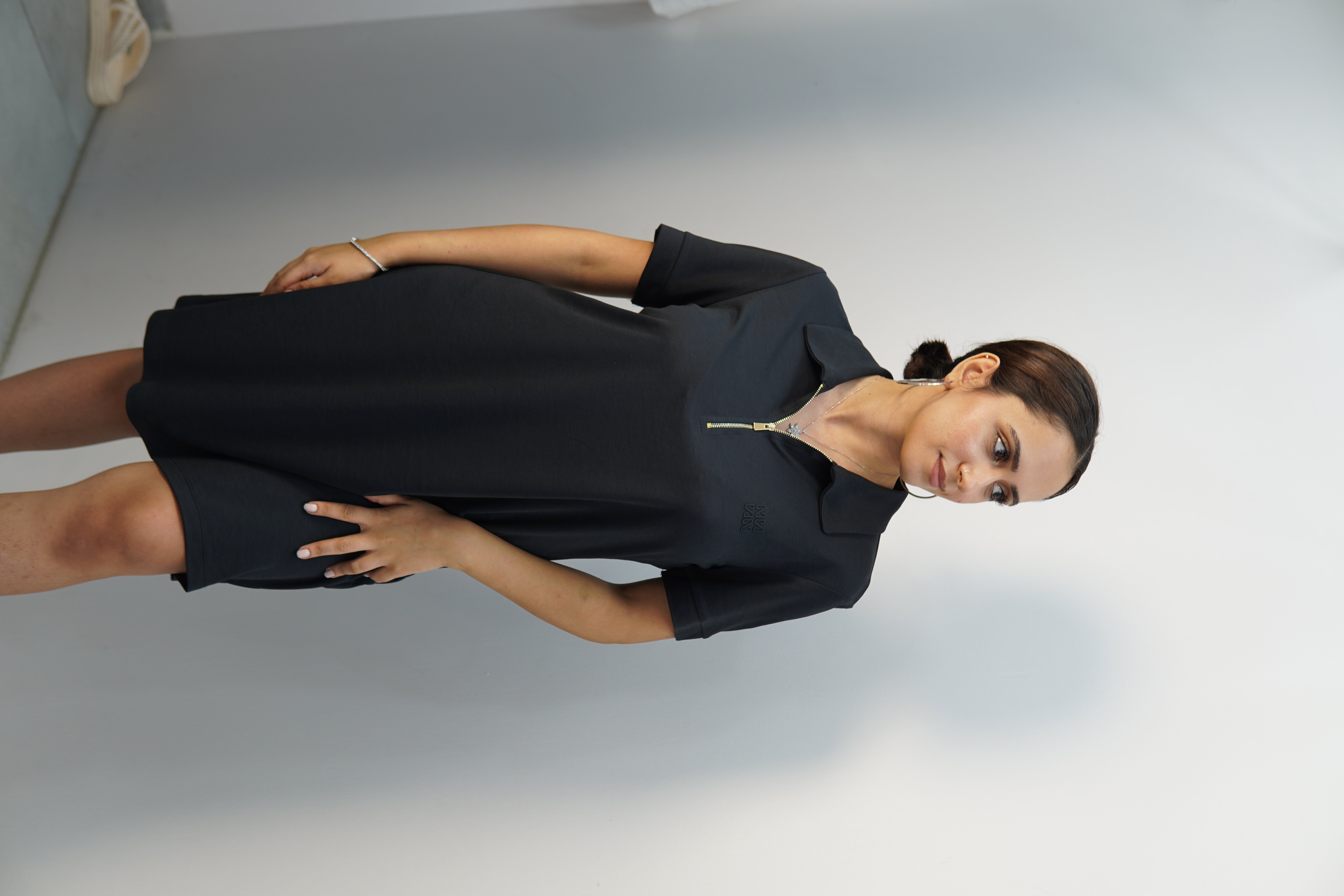 Modern ve şık bir tasarıma sahip olan bu siyah elbise, fermuar ve yakalı detaylarıyla stilinizi öne çıkarıyor. Diz üstü kesimi sayesinde hem günlük kullanımda hem de özel davetlerde rahatlık sağlar. Yumuşak ve kaliteli kumaşı gün boyu konfor sunarken, fermuar ve yaka tasarımı takıma sofistike ve spor-şık bir hava katıyor.